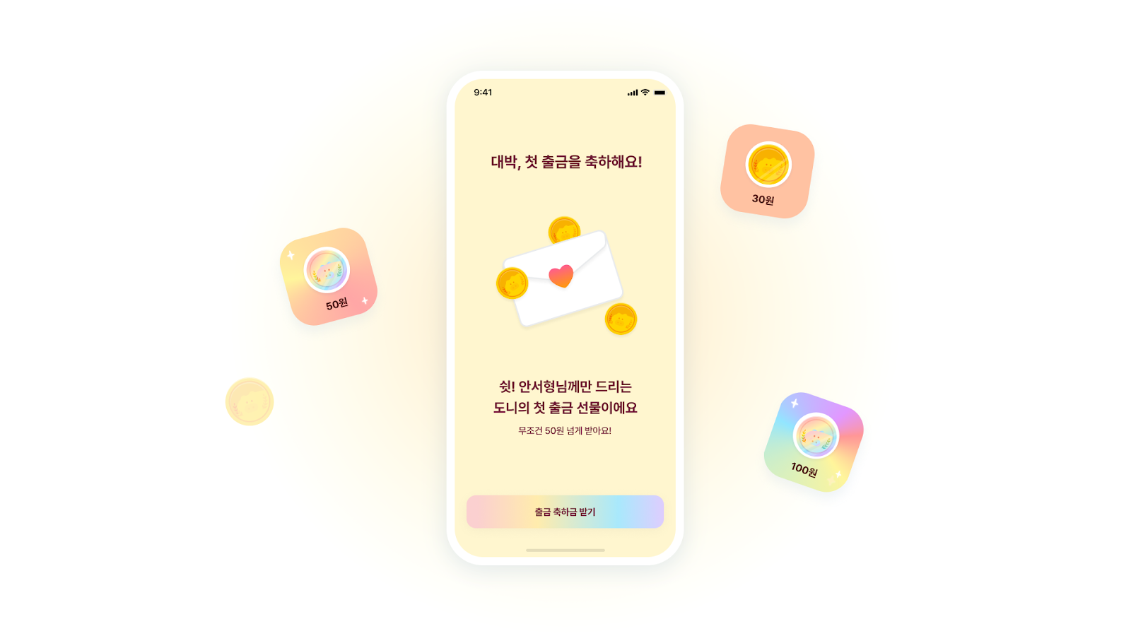 유저가 출금을 신청하면 ‘출금 축하금’을 추가로 지급하고 있어요. 기존의 어떤 앱테크 서비스에서도 없었던 참신한 보상 경험을 드리고 싶었는데, 한 번 출금하더라도 또 열심히 모아서 다시 출금하고 싶게 목표를 만드는 강력한 리텐션 유지 장치가 되어요.